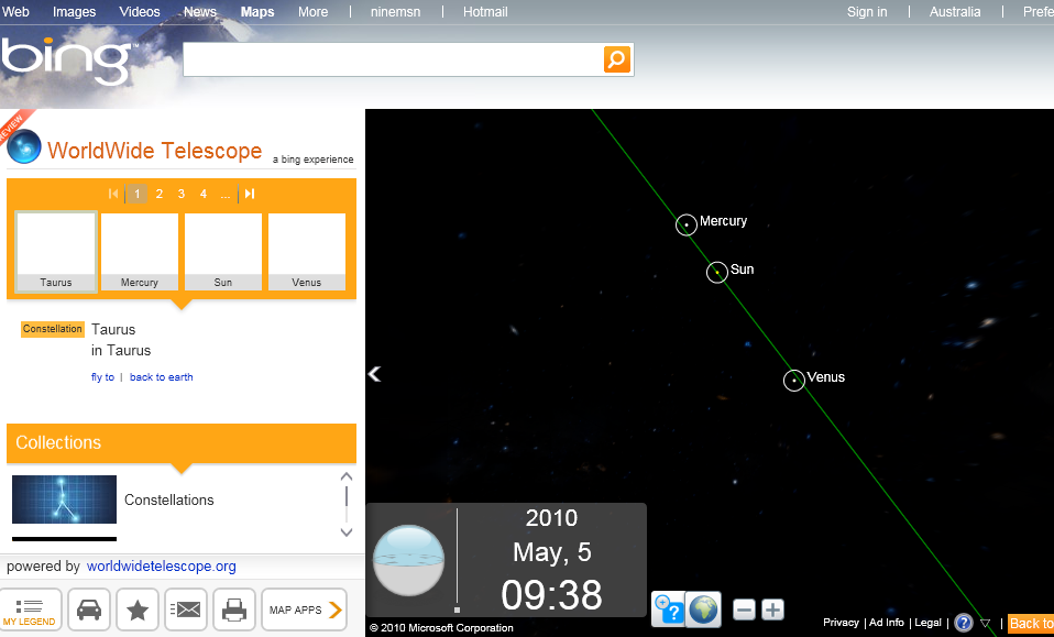 Last month Bing launched their WorldWide Telescope application that allows you to look at the stars and constellations from Bing Maps.